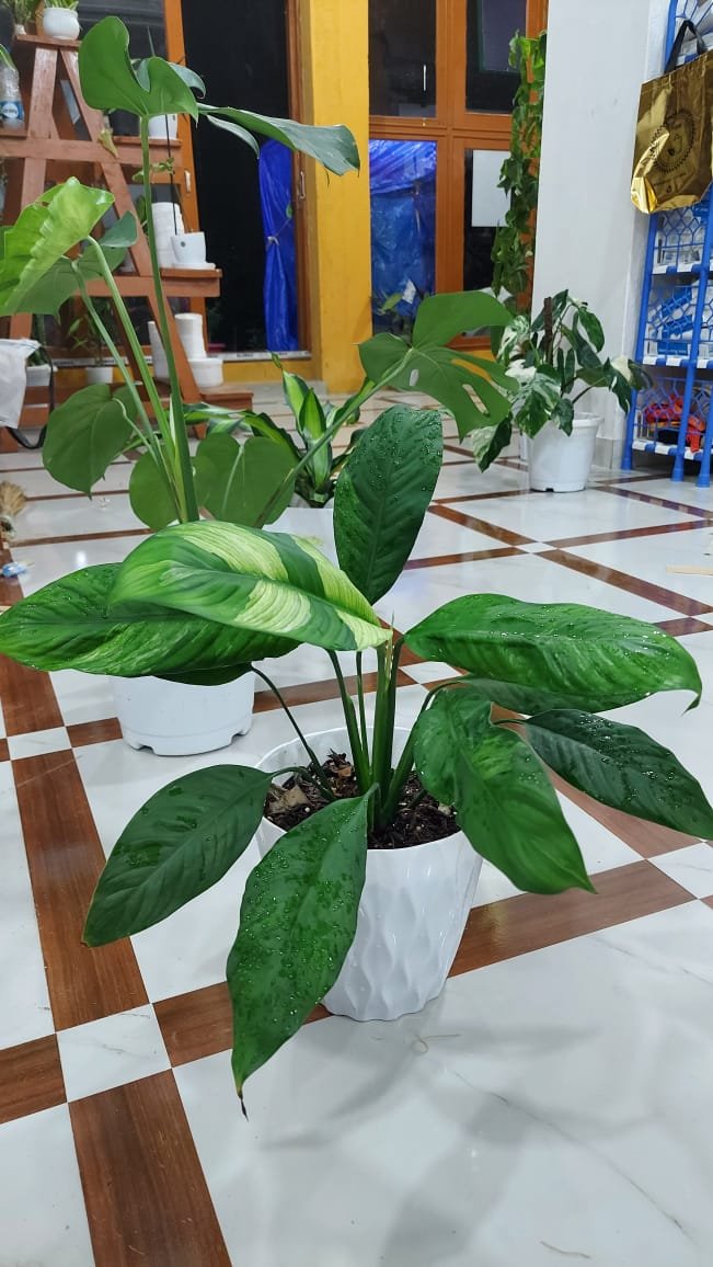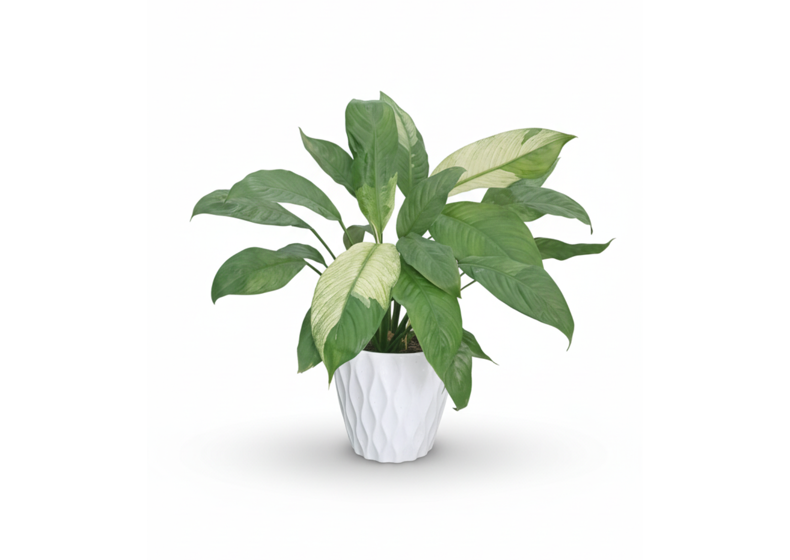 Variegated Peace Lily is a beautiful variation of the classic Spathiphyllum, known for its striking green leaves splashed with creamy white or yellow variegation. Like the standard Peace Lily, it produces elegant white, hood-like flowers (spathes) surrounding a central spadix.